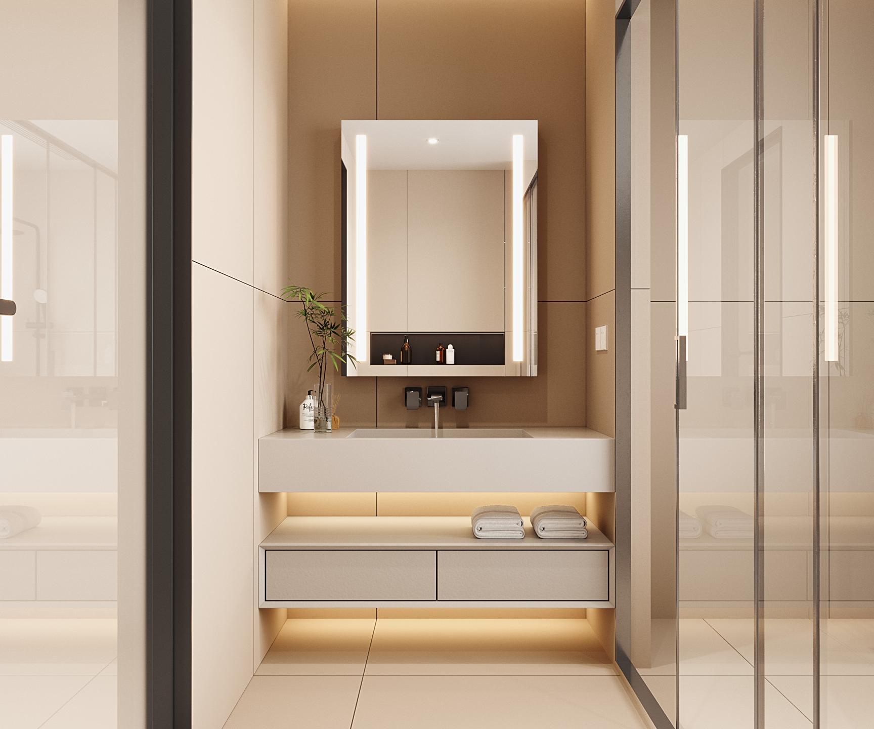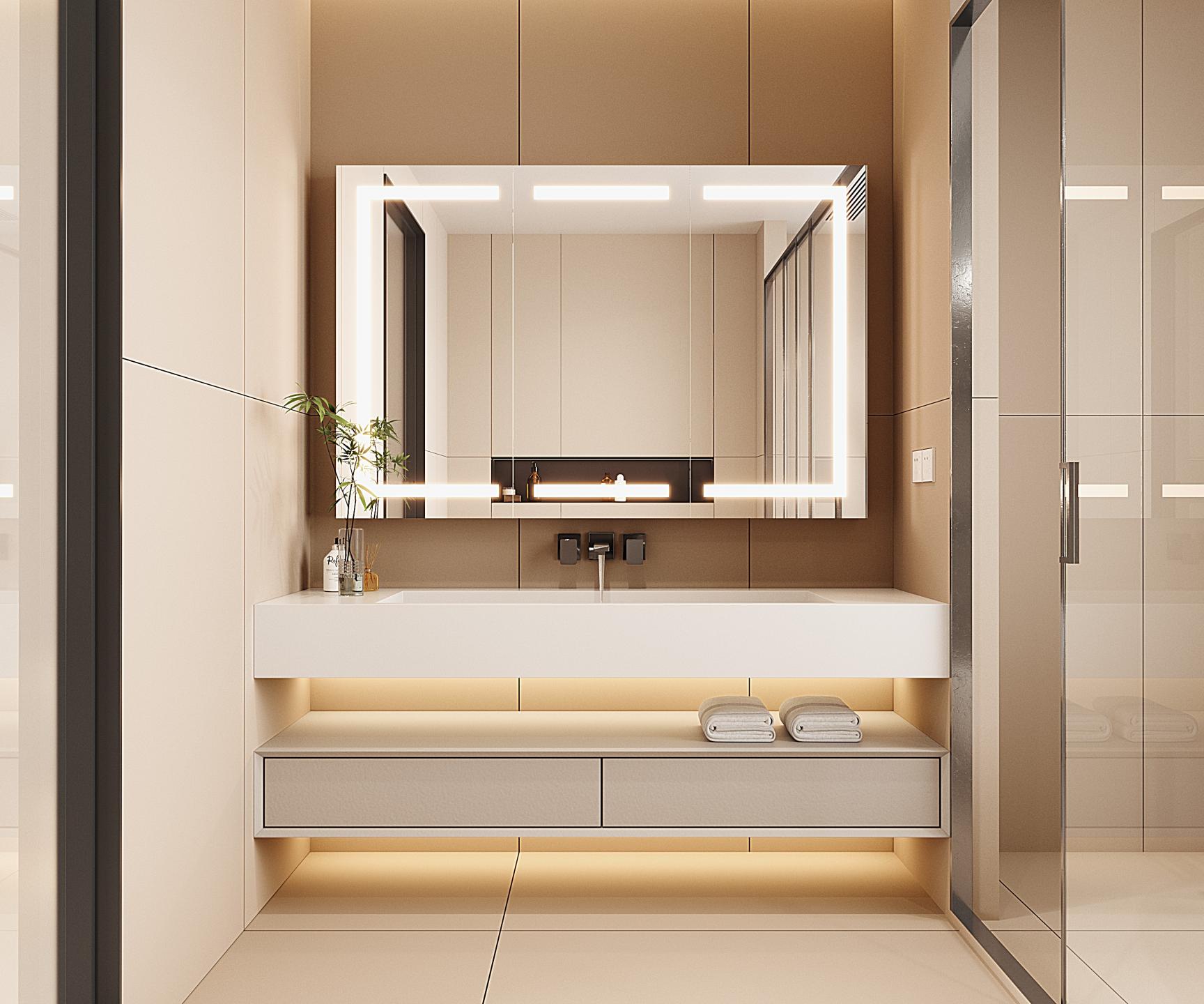 Home Decor Decoration Hotel Room Wall Mirrored Vanity Cosmetic Bathroom Furniture PVC MDF Sanitary Basin LED Washroom Storage Cabinet