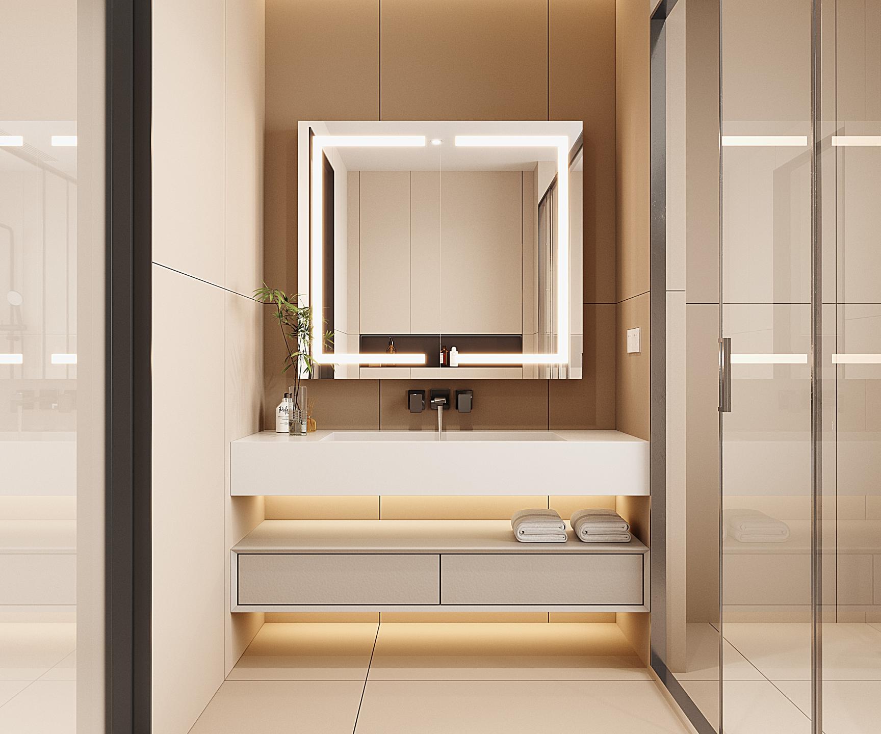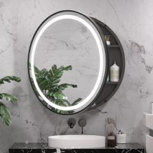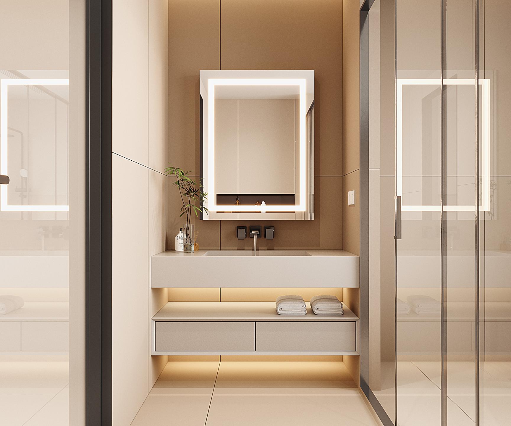 Home Decor Decoration Hotel Room Wall Mirrored Vanity Cosmetic Bathroom Furniture PVC MDF Sanitary Basin LED Washroom Storage Cabinet